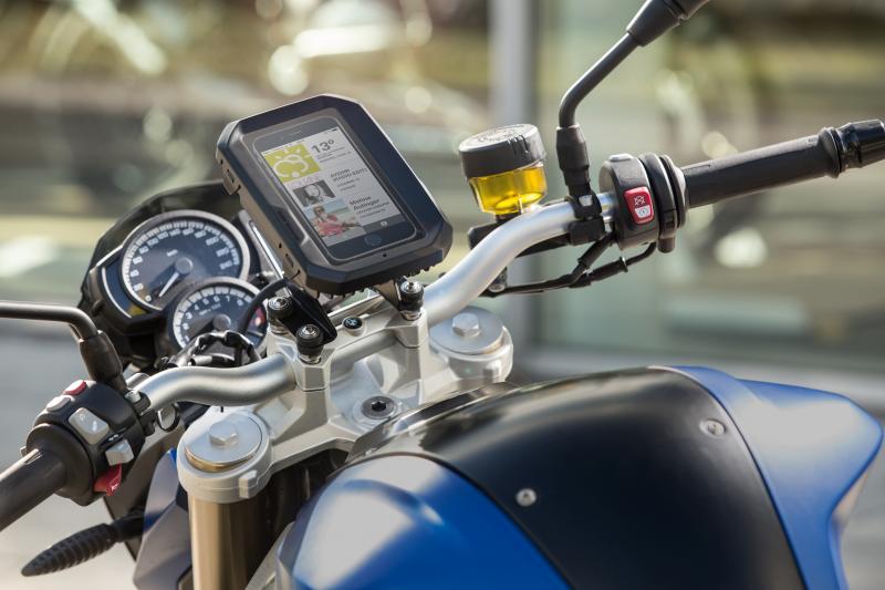 Ezért a BMW Motorrad egy okostelefon-tartót tervezett, amellyel egy legfeljebb 5” nagyságú készülék gyorsan és biztonságosan a kormánybilincsekhez rögzíthető, így szavatolva az optimális láthatóságot és kezelhetőséget. Segítségével a motoros igénye szerinti irányban, mind függőlegesen mind vízszintesen rögzíthető a készülék. Az okostelefon-tartót a BMW Motorrad Navigator V konzoljával (kiegészítő tartozék) lehet a motorkerékpárra szerelni.