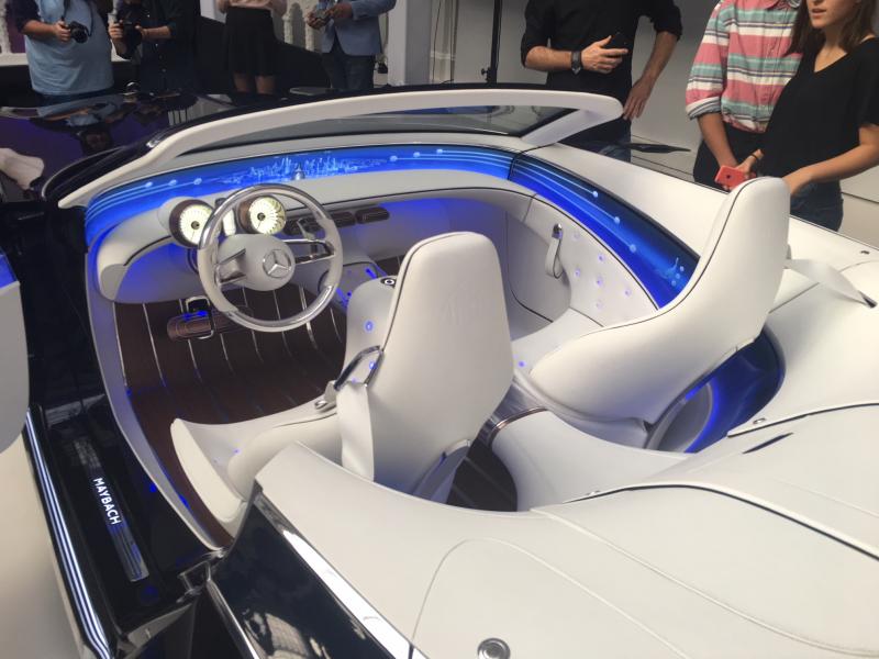 Az autóipari dizájn csúcsát képviselő modellben a belső fapadlót alumínium betétek díszítik, a bársonykék színben tetszelgő koncepcióautó kétszemélyes ülésrendszere pedig fejedelmi kényelmet biztosít. A klasszikus, vintázs hangulatot idéző formák mellett a jármű belsejében a legmodernebb infotainment rendszerek kaptak helyet. A hagyományos értelemben vett nyomógombok helyett érintéssel, vagy akár hangutasítással is kommunikálhatunk az autóval.