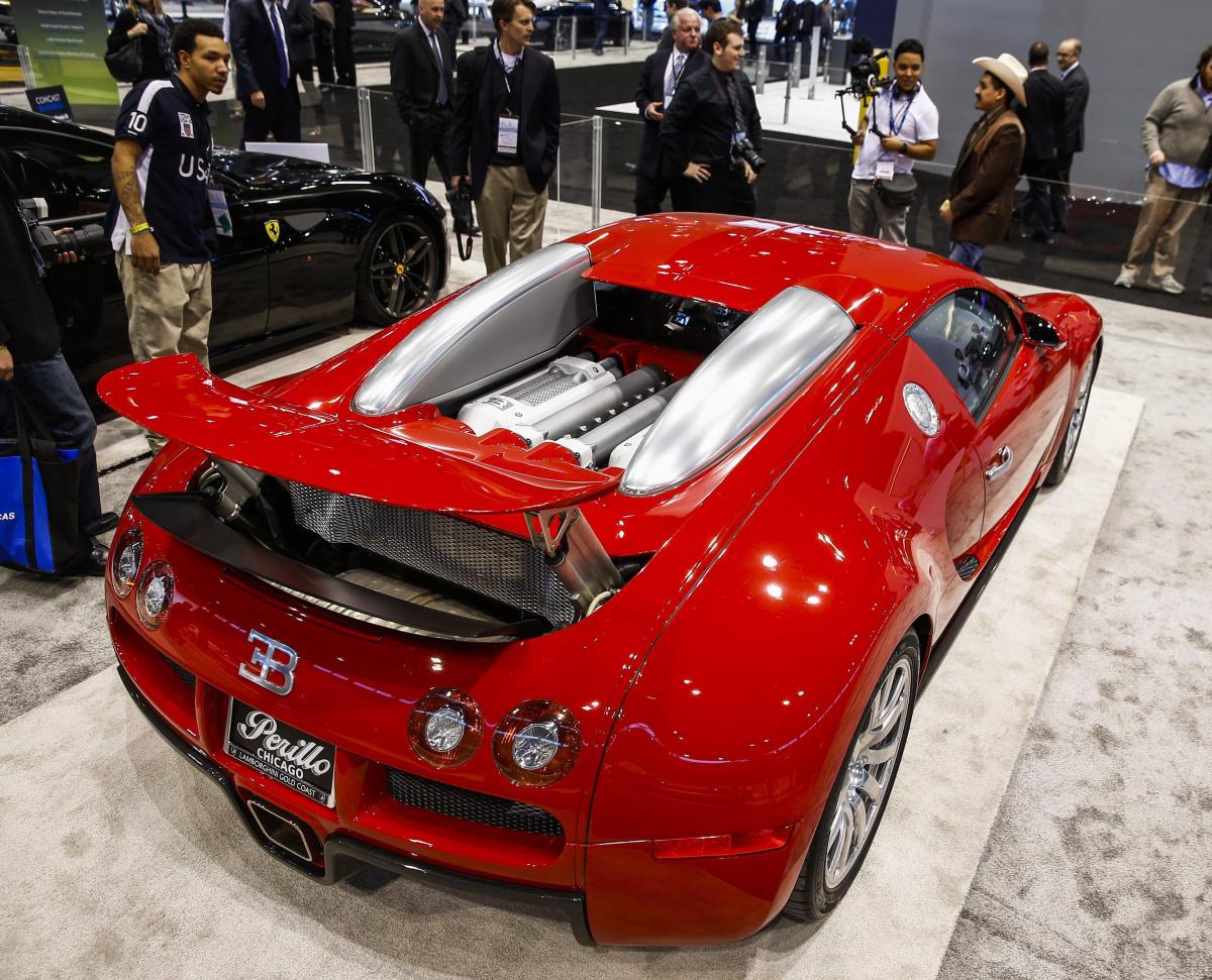 Egy Bugatti Veyron 16.4-es a kiállítási standon a Chicagói Autószalon sajtónapján, 2014. február 6-án, az Illinois állambeli Chicagóban. A járműipari seregszemlét másnap nyitják meg a nagyközönség előtt. (MTI/ EPA/Tannen Maury)