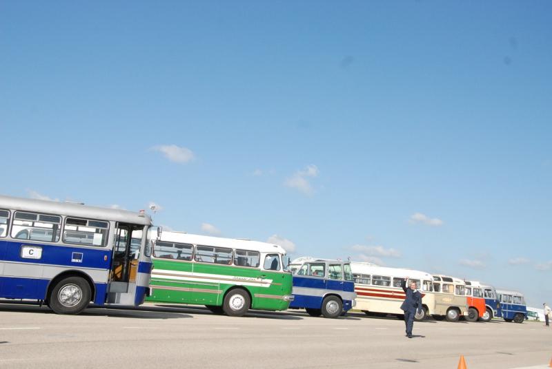 Szokás szerint az újdonságoknál is nagyobb érdeklődés övezte a veteránnegyedet, ahol a hazai gyártású klasszikusok mellett felsorakozott az egykori Malév flotta, melynek része a gyönyörű fényezésű farmotoros 55-ös, az arany-metál Setra, és egykor ugyancsak a repülőtéren szolgáló Lada kombi és felvezető kocka Wartburg, vagyis a 353-as. Nem annyira látványos, mint inkább nevezetes a másik Setra, mely a Rába flottájában szolgált, és egykor államelnököket, pártfőtitkárokat fuvarozott Győrben. A megszokott modell sor idén kiegészült a frissen restaurált MÁVAG TR5-ös és TR3-as buszokkal, melyek a többi magyar busz mellett parkolt. Szokás szerint zarándokhellyé vált az Ikarus 311-es, az 55-ös, 266-os, a 180-as csuklós, és persze a nejlonbuszként emlegetett 30-as, vagy a kabrióvá alakított 630-as. Ahogy a járművek élete, úgy a pilóták sorsa is igazi életregény, miközben maguk is megszállottjai a műfajnak, ezért lelkesen fotózzák is a gyönyörű darabokat. Günder Attila BKV egyenruhában ugrik le nyitott Ikarusból, nem lehetett könnyű útja, mert iszonyatos szélben, de nem iszonyatos tempóban, 50-60 km/órával gurult Zsámbékra a régi 1-es úton, mert hogy a rövid áttételű, tehát városi közlekedésre konstruált sebességváltó csak kínozná az autópályán a gépet. Márpedig azt nem tenné egyik sofőr sem, így a 42 éves Attila sem, aki egykor Ganz Gyártmányú UV villamosokat is vezetett a 47-es járat vonalán, mostanság pedig veterán buszokat hajt.