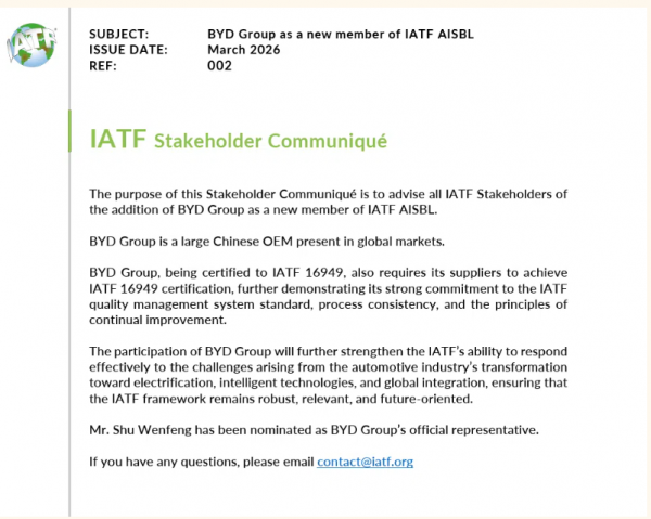 A szervezetben olyan meghatározó autóipari szereplők rendelkeznek tagsággal, mint például a Volkswagen vagy a BMW. A száznál több kínai autógyár közül eddig csak a Geely volt a tagja. A BYD azonban már az elektromobilitás korszakának irányítását formáló új IATF AISBL szervezetbe lépett be, amelyet 2026. március 4-én hoztak létre. Ez az új szervezet felel az autóipari minőségirányítás globális szabványainak meghatározásáért.