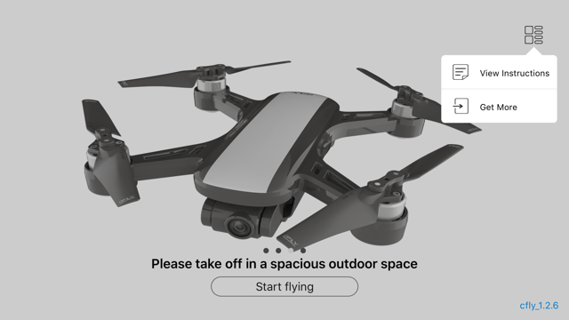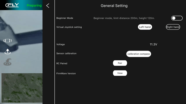 A felhasználói felület egyszerű. Jobb felül a beállítások, kalibráció, és hasonlók. Ezen kívül fent akku töltöttség (dróné) látott műholdak száma, repülési üzemmód (itt nem volt GPS jel beltérben) . Bal oldalon az egygombos felszállás szoftveres gombja, és a hazatérés gombja, meg a mobiltelefonos irányításnak az a módja látható, ahol a drónt a telefon döntésével irányítjuk (ezt bevallom nem próbáltam, de még soha, semmilyen drónon sem, biztos jó móka, én viszont a hagyományos irányító karokban hiszek)