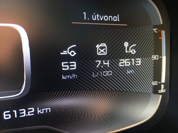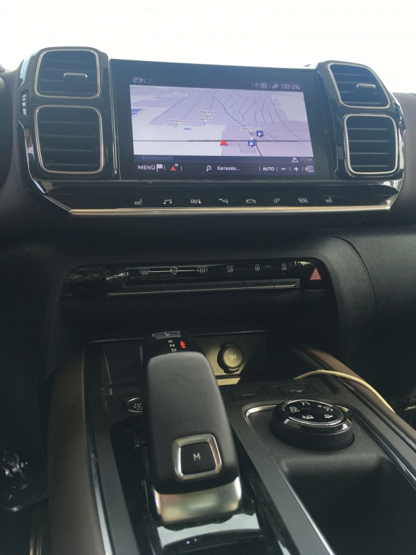 A telefon tükrözésére képes (az iPhone képe varázslat nélkül jelenik meg rajta, csak megfelelő kábel kell hozzá) nyolchüvelykes multimédiás rendszer egyik nagy hibája, hogy a navigáció grafikája elavult, a vezető előtt elterülő 12,3 hüvelykes digitális kijelző rengeteg információt oszthat meg a sofőrrel, én inkább a minimálisra csökkentettem a sorok és pixelek számát. Akinek kedve van hozzá, testre is szabhatja, kezelése nem bonyolult. A középkonzoli érintőképernyő azonban megnehezíti az életünket azzal, hogy a klíma is onnan vezérelhető, így vezetés közben bonyolult a használata. Szerencsére a vezető előtti kijelzőre is kitehetjük a navigációt, így nem tévedünk el, amíg beállítjuk a kívánt hőmérsékletet, zeneszámot vagy masszásmódot (nekem a macskaléptek jöttek be). Tesztautónk szélvédőjébe wifis forgalomfigyelő kamerát is beépítettek, de mivel nem volt hozzáillő kábelem és a hálózati jelszót sem ismertem, nem tudtam letölteni a tesztelés során gyűjtött furcsa közlekedési helyzeteket, amelyek közül kitűnt egy Arad megyei felségjelű VW Tiguan, amely az M0-ás északi szakaszának egyik kihajtóján egyszerűen szembe fordult a forgalommal. Kár, hogy a multimédiás rendszerbe csak egy USB-csatlakozót kötöttek be, így egyszerre nem tudtam használni a CarPlay alkalmazást és hallgatni Cseh Tamást. Választanom kellett, Tamás nyert. Töltésre szerencsére a hátsó USB-csatlakozó alkalmas volt, így nem maradtunk le a legfrissebb Instagram bejegyzésekről sem.
