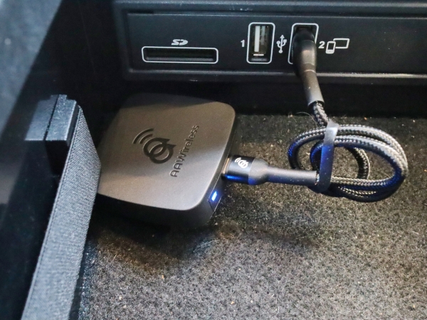 Nyilvánvalóan nem ússzuk meg teljesen a kábelezést, mert nem a jármű fedélzeti rendszerét upgrade-eljük, hanem csak becsapjuk azt. Az AAWireless-t ahhoz az USB aljzathoz kell csatlakoztatni, amelyhez korábban a telefont csatoltuk. Adnak is egy hozzávaló kábelt, szóval erre nem kell külön gondot fordítani. Amíg nincs csatlakozás, a kütyü kéken villog.