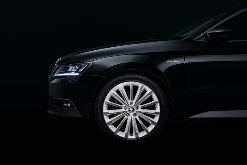 Egyedi kialakítású keréktárcsái a ŠKODA Superb Black Crystal bemutatóautó igazi fénypontjaként szolgálnak: ezeket ugyanis „csillagpor” (StarDust®) nemesíti. Apró, fényes kristályok találhatók a könnyűfém keréktárcsák felületén, amelyek a márka új formatanulmányának különösen hatásos megjelenést kölcsönöznek. Nyáron már ezzel a módszerrel díszítették a Tour de France győzteseinek járó, a ŠKODA Design által megálmodott trófeákat. A bemutatóautó esetében a jármű elején és hátulján, valamint a keréktárcsákon és a kormánykeréken található ŠKODA logók is mind igényes kristályüvegből készültek. Szintén kristályból formálták ki a kormánykerék Laurin & Klement emblémáját.