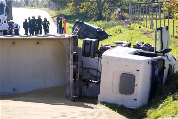 A Zala Megyei Katasztrófavédelmi Igazgatóság a honlapján azt közölte: a két jármű ütközése miatt a búzát szállító teherautó az oldalára borult, rakománya pedig az úttestre dőlt.
