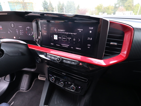 A műszerfal versenyautósan a vezetőre van optimalizálva. A kötelező középső képernyő egy keretbe került a fő műszeregységgel. (Ebben a keretben és az ülések kárpitozásában is kapjuk a piros dekorbetéteket.) A jó fogású, vaskos kormánykeréken a megszokott minőségű Opel gombok és kapcsolók vannak és kapunk F1-füleket is a váltáshoz. „Elhasználódott” dizájnelemként csak a világításkapcsolót tudom felhozni, amelyet kb. 10 éve nézegethetünk az Opel minden modelljében.