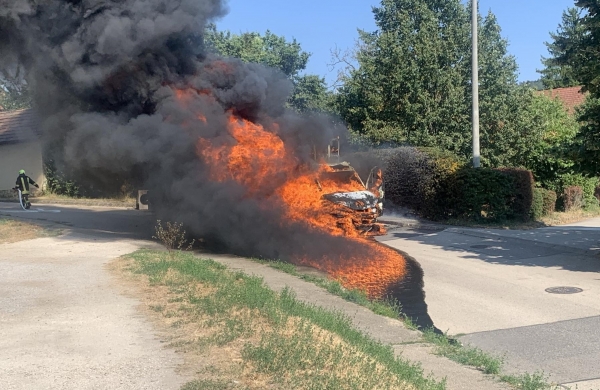Fél órával később már arról írtak a katasztrófavédők, hogy lángra kapott egy kisteherautó Budakeszin, az Arany János utcában. Teljes terjedelmében égett a jármű, amikor a fővárosi hivatásos és a budakeszi önkéntes tűzoltók a helyszínre érkeztek. Az egységek két vízsugárral eloltották a lángokat. A járműben ketten utaztak, ők idejében ki tudtak szállni.