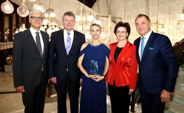 A képen balról jobbra: Thoralf Hanschel, az Audi Hungaria motorgyártásért felelős igazgatósági tagja, Achim Heinfling, az Audi Hungaria igazgatóságának elnöke, Tetiana Baranovska a Győri Balett díjazott magántáncosa, Dr. Knáb Erzsébet, az Audi Hungaria személyügyért és szervezetért felelős igazgatósági tagja, Kiss János, a Győri Balett igazgatója