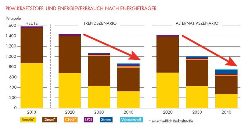 A motortechnika változása sokkal inkább mutat lassú evolúciót, semmi esetre sem revolúciót. 2040-ben az újautó eladás ¾-e belső égésű motoros lesz (benzin, dízel és hibridjei). A diagram segítségével könnyen áttekinthetjük az „erőforrás” összetétel változást. Két forgatókönyvi változatot is láthatunk (Trendszcenario és Alternativszcenario).