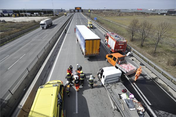 Azt írták, hogy a baleset az autóút 17-es kilométerénél történt. A szigetszentmiklósi és a fővárosi hivatásos tűzoltók feszítővágóval egy embert kiszabadítottak a kisteherautóból – tudatták. A katasztrófavédelem szerint a helyszínre érkeztek a mentők és egy mentőhelikopter is. Az Útinform azt írta, a forgalmat a gerincúti új csomópontnál leterelik az autóútról; a torlódás több kilométeres.
