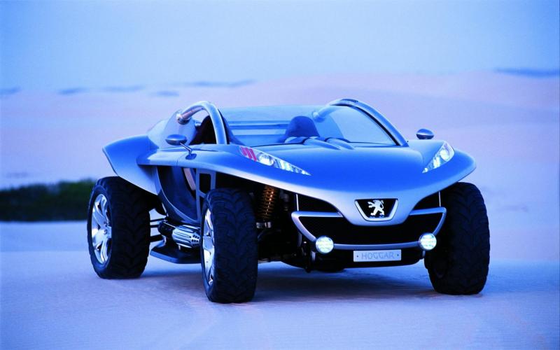Itt van például a strandjáró Peugeot Hoggar, ami a frnacia gyártó 2003-as genfi újdonságai közé tartozott. A Hoggar felépítése leginkább a sivatagi homokfutókéhoz hasonlítható. A nyitott buggy hajtásláncában egy szokatlan megoldását alkalmaztak, nem egy motort, hanem kettőt építettek bele.