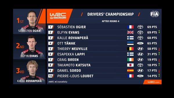 Evans a győzelmével 25 pontot szerzett, így 69 pontjával pontegyenlőséggel áll a világbajnokság első helyén, megosztva a vezetést csapattársával, a nem teljes szezont futó Sébastien Ogier-vel. Evans szombaton állt az élre a Toyotával, amikor Thierry Neuville egy vezetői hiba miatt kicsúszott, és összetörte a Hyundai-t (a belga vasárnap a Power Stage megnyerésével, és 5 bónusz ponttal vigasztalódott).