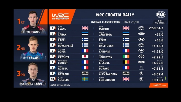 Bár Evans ezen a versenyen nem volt pontszerzőnek nevezve a gyártók világbajnokságában, a Toyota még így is magabiztosan, 29 ponttal vezet a Hyundai előtt. Eddig mindhárom Horvát-ralit a japán csapat nyerte meg, Evans előtt Ogier és Rovanperä is győzni tudott itt a korábbi években.