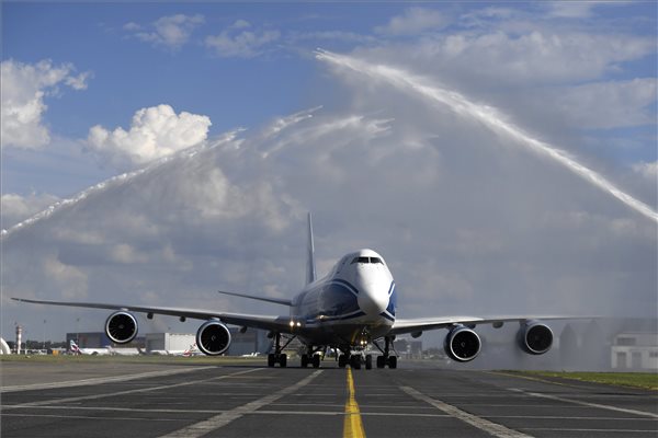 Vízsugárral köszöntik az orosz Air Bridge Cargo teherszállító légitársaság Boeing 747-8F típusú repülőgépét a Liszt Ferenc-repülőtéren 2018. június 26-án. A járat heti két alkalommal repül Moszkva és Budapest között. MTI Fotó: Kovács Tamás