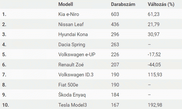 A magyarok körében 2021 legnépszerűbb villanyautós márkája a Kia lett 76,7 százalékos növekedéssel (661 db forgalomba helyezés). A toplistán a második helyen a Volkswagen (összesen 497 példány), a harmadikon pedig a Nissan (474 db) végzett. A modellek versenyét a Kia e-Niro nyerte 61,2 százalékos emelkedéssel (603 db), majd a Nissan Leaf (436) következik a sorban, a dobogó legalsó fokára pedig a Hyundai Kona (296) állt fel.