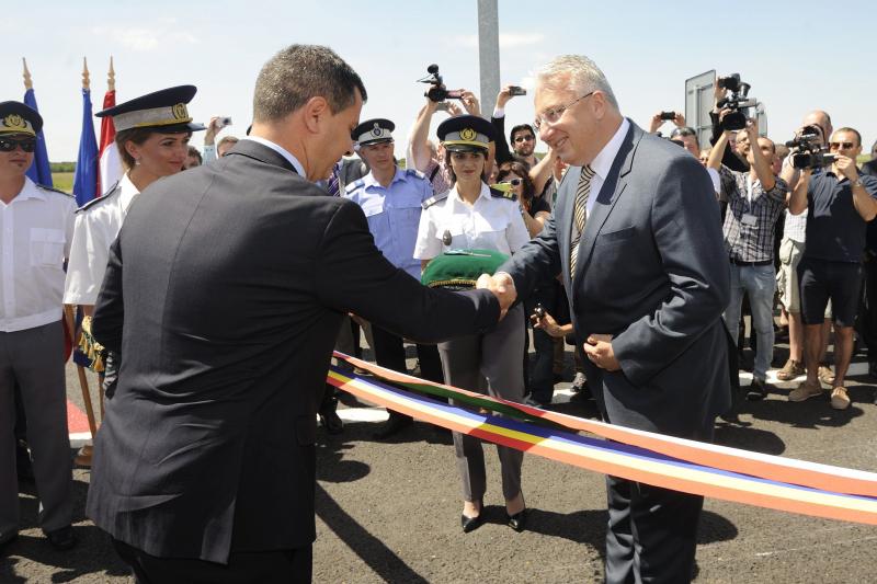Semjén Zsolt miniszterelnök-helyettes (j) és Marius Nica, a román kormány európai alapokért felelős minisztere kezet fog, mielőtt átvágják a két ország nemzetiszínű szalagját a Csanádpalota-Nagylak határátkelőhely és az M43-as autópálya-szakasz avatásán 2015. július 11-én.