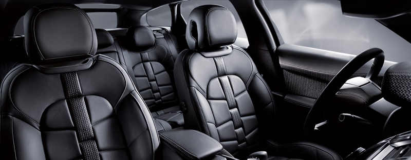 Az utastér az elegancia jegyében született meg : a jellegzetes óraszíj-mintázatú Nappa bőrülések különleges betéteket kaptak, amely visszaköszön az ajtókárpitokon, a műszerpanel árnyékolóján és a könyöktámaszokon is. Mindezt az Amétryne zöld színű (A DS E-Tense nagy sikert aratott karosszériaszíne) plüssbetétek használata bolondítja meg, amellyel a rakodórekeszek belsejében és a szőnyegeknél találkozunk, utóbbiak vastagsága és kényelme egyedülálló az autók világában. A hab a tortán a 3D nyomtatású titán váltógomb, amelyen visszaköszön a bőrkárpitozás motívuma. A kifinomultság minden részletre kiterjed : az autóhoz tartozó egyedi táskaszett kézi varrással, marhabőrből készült. A szatén bélésnél itt is visszaköszön az Amétryne zöld szín.
