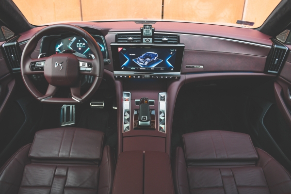 No, nem mintha a sofőr pozíciója olyan rossz lenne a DS 9-ben. Remek fogású a rubinvörös Nappa bőrkormány, felettünk Alcantara tetőkárpit húzódik, a módválasztó és a könyöklő pedig magától értetődően kézre esik. Látványos a digitális műszercsoport, ami akár az éjjellátó kamera képét is kivetíti, és továbbra is kedvencem az indításkor kibukó B.R.M R180 kvarcóra. Mindössze a 12-colos infotainment kijelző csorbítja valamelyest a fennséges élményt, aminek a grafikája a hagyományos márkák szintjén remek, ilyen prémium körítéssel viszont látványosan elmarad a színvonala. Kissé nehézkes, hogy mindent az érintőképernyőről kell állítani, így az ülésfűtést vagy a klímát is, de leginkább a navigáció egyszerűsége hat furcsán egy ilyen igényes kabinban.