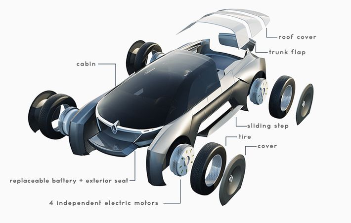 Jurowski négy független, elektromos motort képzelt el, melyek a Renault kerekekben kaptak helyet, hogy ezzel növelje a belső teret az utasok számára, és nagy tárgyak is biztonságosan elférjenek a hátsó részben. Jurowski látványosan különálló kerekeket tervezett, ami egy új esztétikai megoldást vezet be az autókarosszéria tervezés világába.