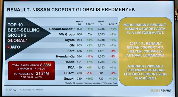 A legdinamikusabban fejlődő csoporttá avanzsált a Renault-Nissan szövetség a JATO Dynamics által készült riport alapján, mely szerint márciusban a legtöbb autót (2,33 millió darabot) a francia-japán konszern adta el világszerte, az első negyedéves összesítésben is előkelő helyet, a dobogó harmadik fokát vívták ki maguknak.