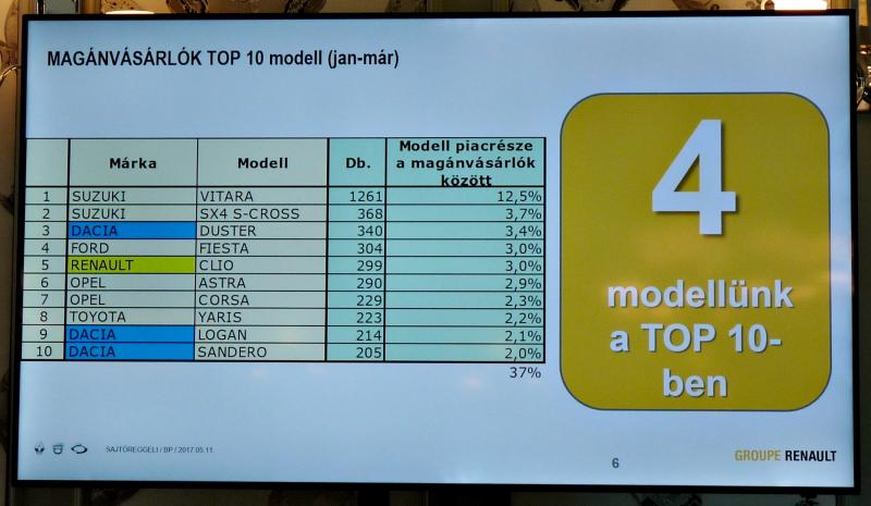 Wachtler Tamás ügyvezető igazgató elmondása szerint az idei év első 4 hónapjában a magánvásárlók körében 28 százalékos növekedést ért el Renault-Dacia az előző év hasonló periódusához képest. Fentiek érdekessége, hogy a 2,4 százalékpontos gyarapodás kétharmadát a Dacia modellek eladásának köszönhetik, melynek hátterében főképp a hazai piac sajátossága áll, a Renault eladások progressziója mögött pedig a 2012 óta tartó folyamatos paletta megújulás vélhető. Ez utóbbi esetében tényleg figyelemre méltó, hogy a márka a 2016-os év végéig 6 kategóriában mintegy 14 modellfrissítést vagy újdonságot dobott piacra, és az idei év is tartogat még bőven érdekességeket.