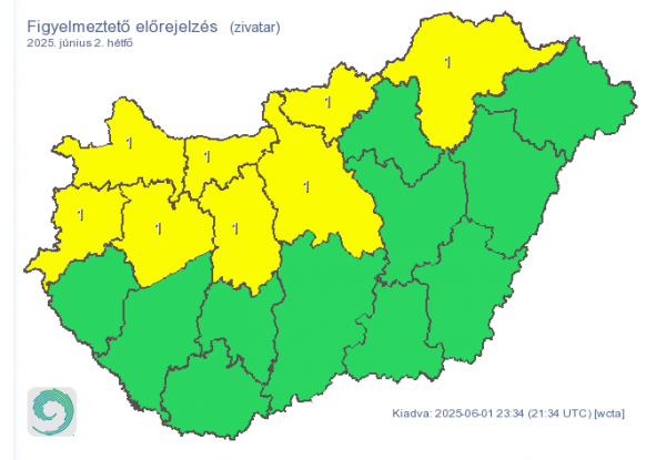 Hétfőn az északnyugati, északi területen alakulhatnak ki elvétve zivatarok, intenzív csapadék (15-25 mm), jégeső (~1 cm) és viharos (~60-70 km/h) széllökés kíséretében. Estétől északnyugat felől növekszik némiképp a zivatarhajlam, ekkor egy-egy intenzívebb zivatar is előfordulhat a határhoz közeli területeken.