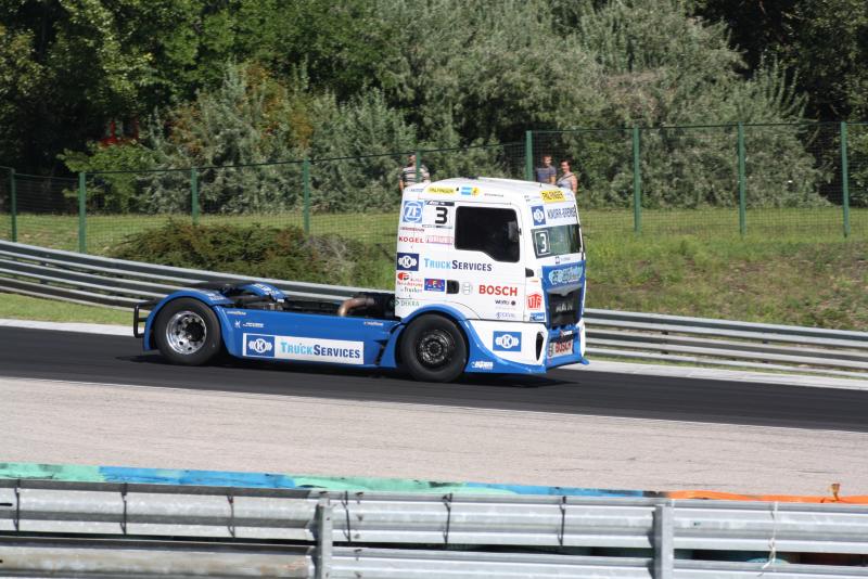 A harmadik kör sokkal nyugodtabb volt, Halm kezdett elhúzni, ugyanis Vojtisek mindenkinél lassabb volt, de megelőzni még nem tudták. A 2-5. helyen centikre autóztak egymástól, olykor egymás mellett, mint mögött. A „párhuzamos közlekedésnek” az lett az eredménye, hogy előbb Körber, majd Kiss Norbi is megelőzte Lackót. Vojtisek LIAZ-a, elnézést, az a múlt században volt, szóval MAN-je továbbra is nagyon „széles” volt, sokáig nem bírt vele a másik veterán. A célegyenes végén aztán Körber elfékezte magát, amit Kiss Norbi használt ki a legjobban, megelőzte a németet. De ment vele Lacko és Hahn is, megint nagyon sokan voltak egymás mellett a 2-es kanyar előtt. Kicsit hátrébb Kursim és Janiec vívtak, a pálya kanyargós, felső részén gyakorlatilag végig egymás mellett menetek. Ilyet is ritkán látni a Hungaroringen, hogy ennyi ideig ennyire fej-fej mellett haladjon két versenygép!