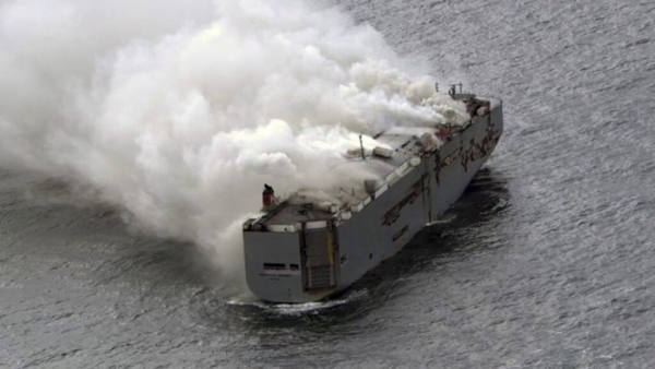 A Fremantle Highway nevű teherhajó, fedélzetén 3783 járművel - köztük 498 elektromossal - kigyulladt a holland partoknál.