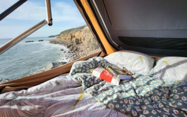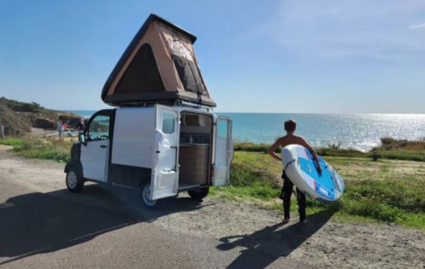 Ez a lakóautó amilyen kicsi, annyira konpakt is. A 3 méter hosszú és 1,5 méter széles modellben helyet kapott egy nappalival kombinált, teljesen felszerelt konyha, az autó tetején pedig egy kinyitható kempingsátor, ahol két személy számára lehet megágyazni. Ez a hálószoba a kocsi oldalára szerelt létráról könnyedén elérhető, már csak azért is, mert a lakóautó mindössze 1,83 méter magas.