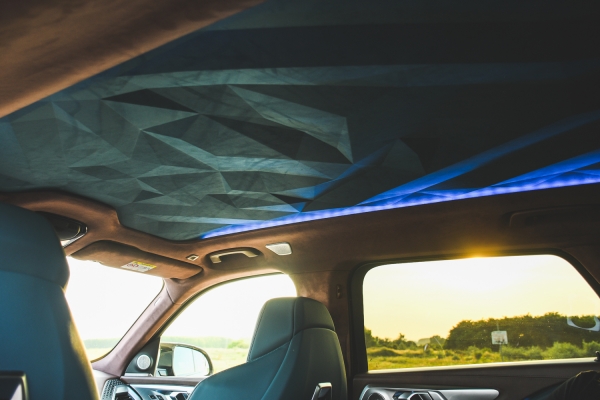 Ültem már magas személyautóban, de az XM-nek intenek a kamionsofőrök, mert egy magasságban ültök. Magasra kell belépni, mint egy haszonjárműbe, ahogy magasan van a csomagtartó küszöb is, ami a kocsi méretei ellenére csak 527 literes. Persze odabent sem nyugszik a szemünk. Életemben először láttam barna alcantara tetőt, vagy full kék ülésszettet. Bár tetszetős a színkombináció, a kristályosan domborított tetőnél kicsit kileng az ízlésmércém, amin ráadásul körbefut a hangulatvilágítás is. Nem, ez nem egy nyitható tető, csak úgy néz ki. Olyan odabent ülni, mint egy színházban, vagy inkább moziban. Na jó, legyen inkább nightclub.