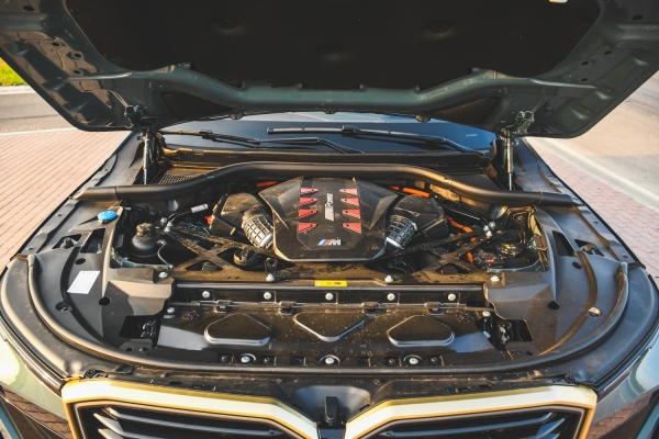 Én meg még azt hittem, hogy a BMW iX volt túlzás, de az ehhez képest egy kompakt városi autónak érződött. Ügyes és látványos megoldás a keret nélküli hátsóablak is, gravírozott BMW logókkal a felső sarkokban, de teljesen hátulról nézve jön ki leginkább, hogy a dizájnerek mennyire nem tudtak mit kezdeni egy ennyire széles dömperrel. Kipufogóvégből oldalanként kettő van, egymás felett, megkérdőjelezhetően elhelyezve. Korábban a Civic Type-R-t még kiröhögtük hasonló megoldásokért. Oké, legalább minden kipufogóvég igazi, ahogy a légbeömlők is. Nem csoda, hisz kell a levegő a 4,4 literes V8-nak a motortérben, ami egy szintén erős, 197 lóerős villanymotorral teszi ki a plug-in hybrid hajtást.