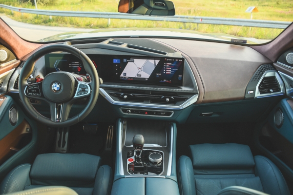 Aztán jön az újabb kulturális sokk, amikor meglátod az M-es modellek tologatható váltó elrendezését és kormány mögötti váltófüleit. Ja, igen. Ezen a ponton már arra érdemes emlékeztetni magunkat, hogy ez amúgy egy M-esnek is szánt modell, akármennyire nem úgy néz ki. Mindezt tudatja is, amikor indításkor végigfut egy M-csík a tetőn, és olyan vészjósló morajlást játszik le, amit egy hollywoodi mozifilm előzetese is megirigyelne. A fizikát meghazudtolóan löki ki alólunk ezt a batárt a 653 lóerős rendszerteljesítmény, miután megpöccintjük akármelyik felprogramozható M kapcsolót a kormányon. Felhördül, az orra megemelkedik, minden váltáskor hatalmasakat bólint, és lehetetlenül elmegy keresztbe. Komédia. Végigmosolyogtam az összes közös autózást.