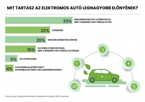 Az előnyök között a legtöbben (33 százalék) azt emelték ki, hogy az e-autók nem szennyezik úgy a környezetet, mint a benzines, vagy dízel járművek. A válaszadók valamivel több mint ötöde a csendességüket tartja a legnagyobb előnyüknek, 15 százalék pedig azt, hogy olcsóbb a fenntartásuk, mint a belsőégésű motorral szerelt autóknak.