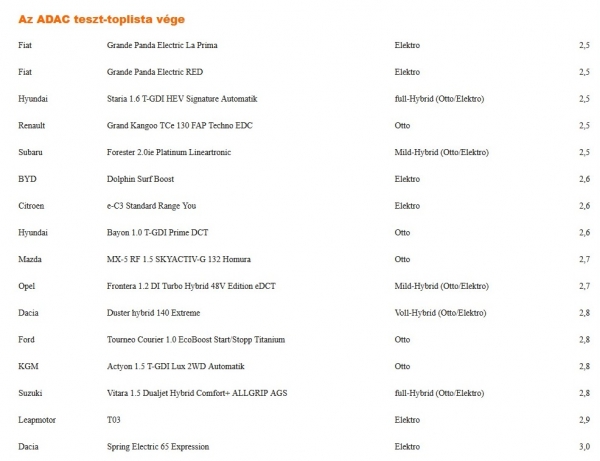 A német autóklub, az ADAC összesítette az általa tavaly tesztelt autók eredményeit, és nyilvánosságra hozta a toplistát, amely olyan hosszú, hogy csak az elejét és a végét közöljük.
