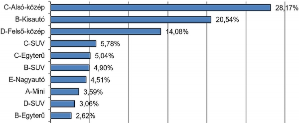 Amint a Data House grafikonja mutatja, a használtpiaci szegmensek forgalma némileg eltér a használtimport favorizált szegmenseitől, de amíg a használtimport harmadik legnépszerűbb kategóriája 15,28 százalékkal a kisautóké, addig a belpiacon a kiskocsik 20,54 százalékos átírási részesedéssel a második helyre kerültek a héthavi összesítés szerint.