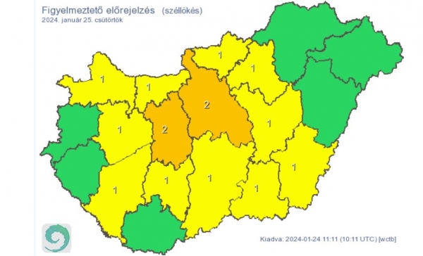 Pest és Fejér vármegyére csütörtökre másodfokú (narancs) figyelmeztetést adott ki a viharos szél veszélye miatt a HungaroMet Zrt., az ország többi részére - Vas, Zala, Baranya, Borsod-Abaúj-Zemplén, Szabolcs-Szatmár-Bereg és Hajdú-Bihar vármegye kivételével - pedig elsőfokú figyelmeztetést, ezeken a területeken a várt legerősebb széllökések sebessége meghaladhatják az óránkénti 70 kilométert is.