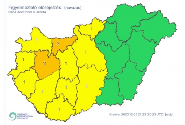 Előbb a Dunántúlon, majd a nappali órákban a Duna vonalának környezetében is egyre többfelé a havazás, havas eső válik jellemzővé. Szerda éjfélig az említett tájakon nagy területen alakulhat ki 5 cm-t meghaladó vastagságú - 5-15 centiméteres - vizes, tapadó hóréteg.
