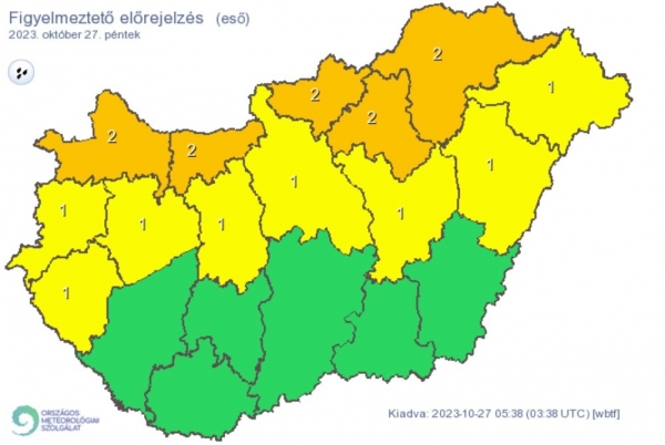 Az ország északi felén nagy területen hullhat 20-30 mm-t meghaladó csapadék a nap folyamán, de a határhoz közeli és hegyvidéki tájakon néhol 50 mm-t meghaladó mennyiség is összegyűlhet - figyelemeztet az OMSZ honlapja.