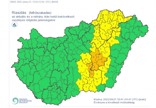 Zivatar veszélye miatt elsőfokú figyelmeztetés van érvényben Bács-Kiskun, Békés, Borsod-Abaúj-Zemplén, Csongrád-Csanád, Fejér, Győr-Moson-Sopron, Hajdú-Bihar, Heves, Jász-Nagykun-Szolnok, Komárom-Esztergom, Nógrád, Pest, Szabolcs-Szatmár-Bereg, Vas, Veszprém és Zala vármegyék területén.