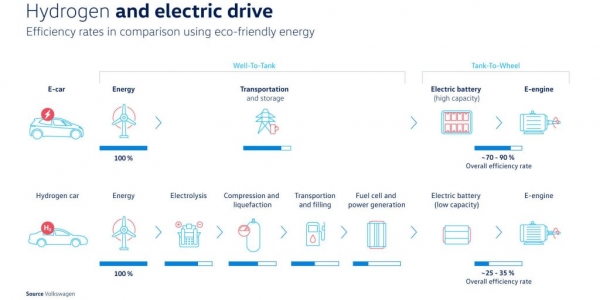 Sajnos már Japánban, a hidrogénes hajtások másik virágzó országában is csappan a lelkesedés. Novemberben a Honda jelentette be, hogy bizonytalan időre felfüggeszti üzemanyagcellás fejlesztéseit. Ellenben a Toyota kiáll a technológia mellett, ahogy a másik nagyágyú, a Hyundai is, és egyelőre a BMW-től sem érkeztek a fejlesztést cáfoló hírek. Egyébként a Volkswagennek is voltak tevékenységei hidrogén ügyben, de állításuk szerint minden az akkumulátor mellett szól, és igazából semmi értelme jelenleg hidrogénnel próbálkozni, és állításukat az alábbi grafika is alátámasztja.