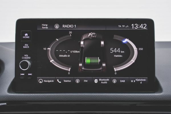 Egy idő után elkezded megtanulni a praktikákat, hogy mikor érdemes hosszan kigurulni, hogyan kezeld a pedálokat, hogy a legtöbbet mehess villanyról, és mennyit számít egy apró gázemelés is, hogy kisebb fogyasztást érhess el. Tehát a Honda Civic új élményfaktora a költséghatékonyság, ami legalább annyira leköt, mint a közvetlen kormányzás vagy éppen az aszfalthoz tapadó futómű – amik továbbra is elnyűgözőek a Civicben. Noha jóval semlegesebb lett a vezethetősége a CVT-váltó miatt, azért még így is élmény egy vidéki úton hajtani vele, ráadásul a 183 lóerős rendszer teljesítmény a legtöbb helyen bőségesen elég.