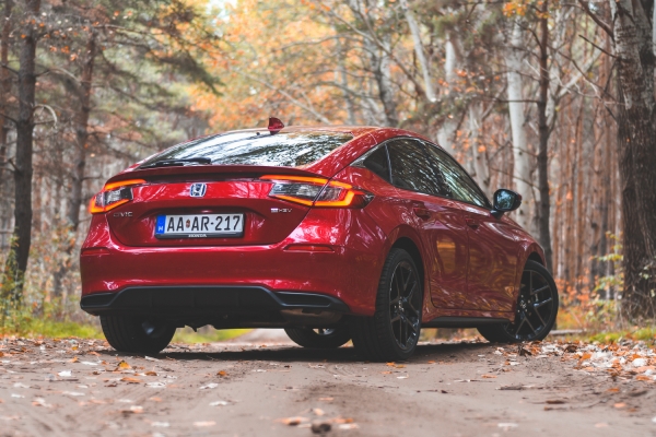 Úgyhogy kissé aggódva olvastam a híreket a tizenegyedik generációról. Csak hibrid hajtással és csak CVT váltóval érkezik Európába az új Honda Civic – persze a Type-R-t kivéve, ami marad hagyományos. Tényleg elvesztettem volna a kis játszótársam? No, azt megnézem magamnak! Gyönyörű vörös fényezésben, Advance csúcsfelszereltséggel kaptam kézhez az új Civicet – még napfénytető is járt hozzá. Már messziről látszik, hogy sokat puhítottak a korábbi polgárpukkasztó formavilágon. Itt már nincsenek élesen kiálló elemek, sokkal diszkrétebben futnak egymásba a vonalak. Kellemes a szemnek, oldalról pedig látszik, hogy nagy ívben gömbölyítették a tetőt, hogy tágas utasteret kapjunk.