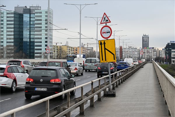 Dilatációjavítás miatt sávlezárás az Árpád híd Pest felé vezető oldalán, a margitszigeti lehajtó utáni szakaszon 2024. február 12-én. A munkálatok várhatóan negyven napon át tartanak. MTI/Máthé Zoltán