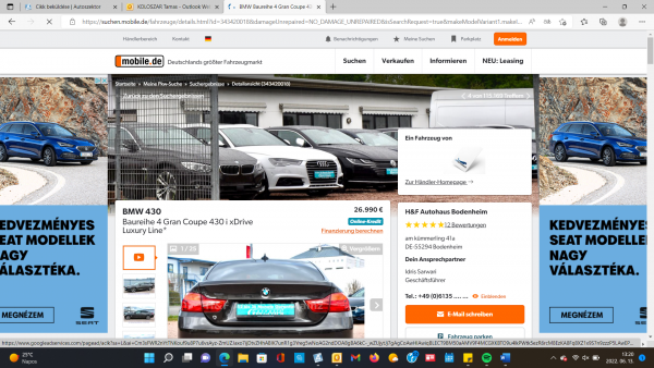 Eladó autó a mobile.de oldalán. Képernyőfotó.