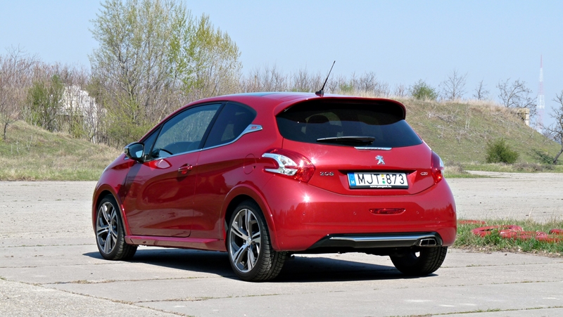 A kormány rásegítése sokkal visszafogottabbnak érződik, mint a 208 GTi-nél, amit okozhat az is, hogy az autó tömegének kétharmada terheli az első kerekeket. A tömegeloszláson hivatott javítani a 85 és 155 km/h-nál nyíló hátsó légterelő, ami látványban is sokat dob az egyébként is dinamikus külsejű autón. Örökkévalóságig tetsző részletnek is nevezhetném a sárvédő egy részével együtt nyíló motorháztetőt és a matt fekete tetőíveket, valamint az általuk közrefogott Gurney-púpokat. Nem kérdés, hogy ez az autó a stílusról szól, és teljesen öncélú formai megoldások tobzódnak rajta kifogástalan harmóniában, retinába égő összhatással. A csomagtér és az utastér helykínálata tökéletesen elegendő, ha rendeltetésszerű (tehát nem családi) használatról beszélünk, ugyanakkor a körbeláthatóságot nagymértékben csorbítja a hegyes szögben elfektetett szélvédő és vaskos tetőív pár.