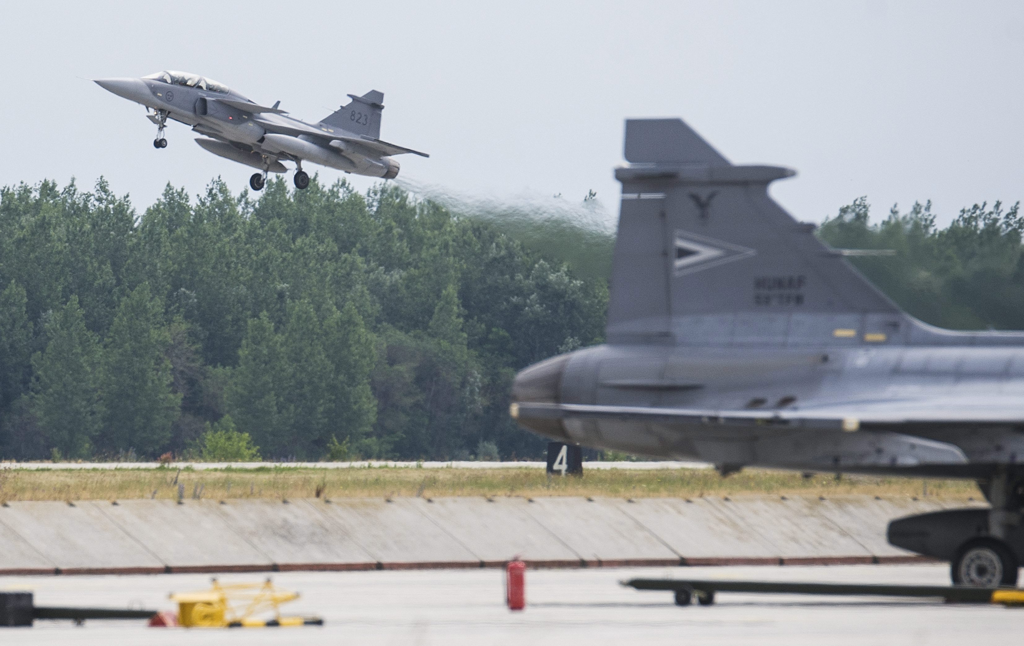A levegőbe emelkedik egy Gripen vadászrepülő Kecskeméten