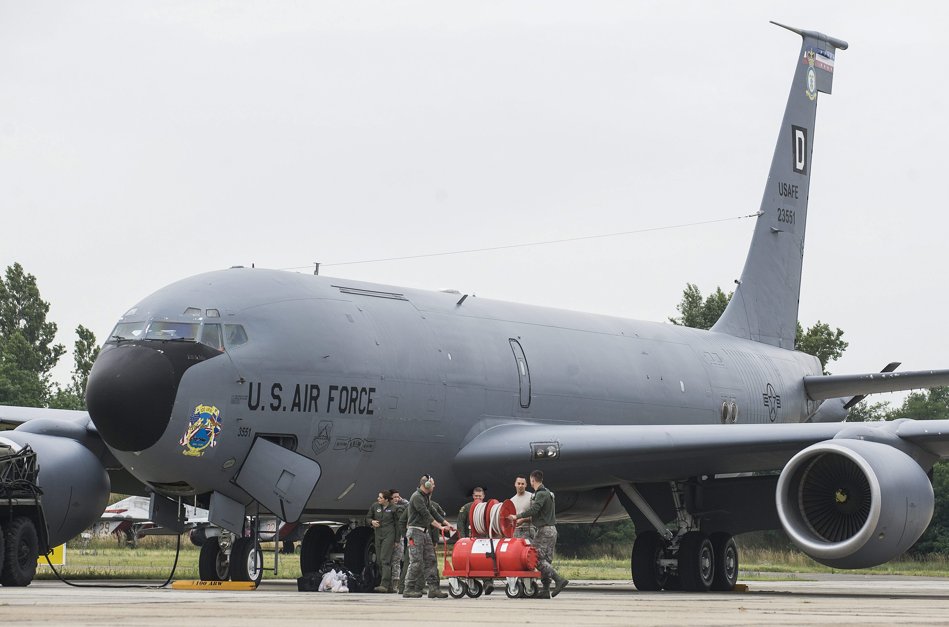 Üzemanyagtöltést végző amerikai katonai repülőgép és a legénység a kecskeméti betonon