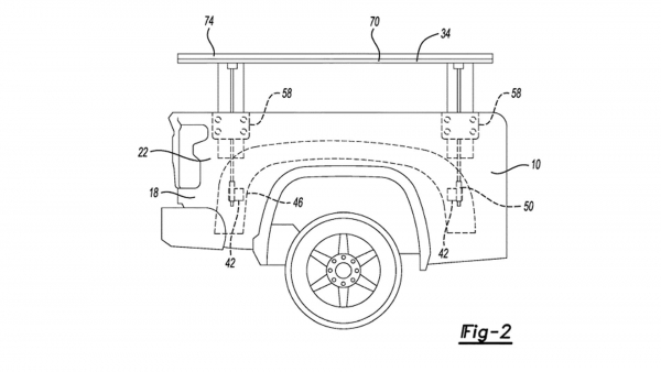 Ilyesmi lehet a Ford egyik idei szabadalmi ötlete is, amely a pickupok platójának oldalsó korlátait gondolja át. Az amerikai gyártó fő profilja a pickupok és SUV-k, nem meglepő, hogy legtöbb szabadalmi ötletük is ehhez a két szegmenshez kötődnek. A Ford ötlete egyszerűen hangzik: a plató oldalán elhelyezkedő korlátok, amelyek főképp fogódzóként szolgálnak, vagy köteleket lehet kötni rájuk a szállított csomagok stabilitása érdekében, új funkciót kap. Ez az új funkció pedig a leginkább egy teleszkóphoz hasonlít számomra, mivel ezeket a korlátokat ki lehetne húzni a plató oldalából, tetszőleges magasságba állítva, majd vízszintes irányban is lehetne mozgatni, ezzel pedig egy kvázi darut létrehozva, amelynek végére nehezebb csomagokat lehetne erősíteni, amelyeket aztán könnyebben be lehet tenni a csomagtérbe.