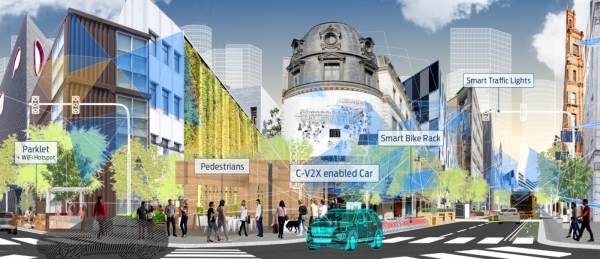 A tesztben résztvevő autók a városban haladva térinformatikai helyzetük és a közelükben levő digitális útjelzések alapján egy központi számítógép-rendszerről kapnak információkat az utakról és a parkolási lehetőségekről.